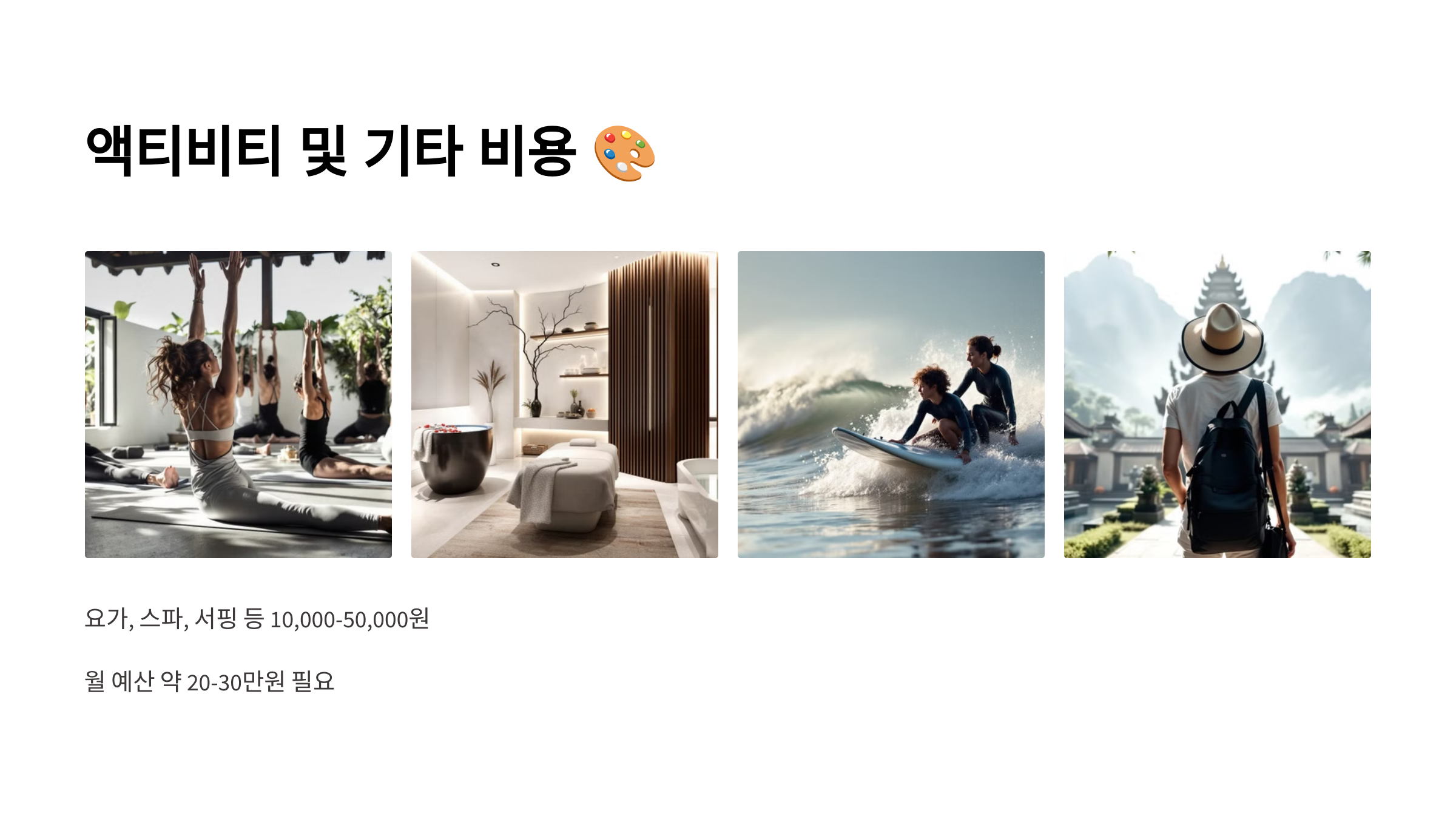 발리에서는 다양한 액티비티를 즐길 수 있습니다. 요가 클래스, 스파, 서핑 레슨 등은 각각 약 10,000원에서 50,000원 정도의 비용이 발생합니다. 또한, 관광 명소 입장료나 기타 여가 활동을 고려하여 한 달에 약 20만 원에서 30만 원 정도의 예산을 할당하는 것이 좋습니다.