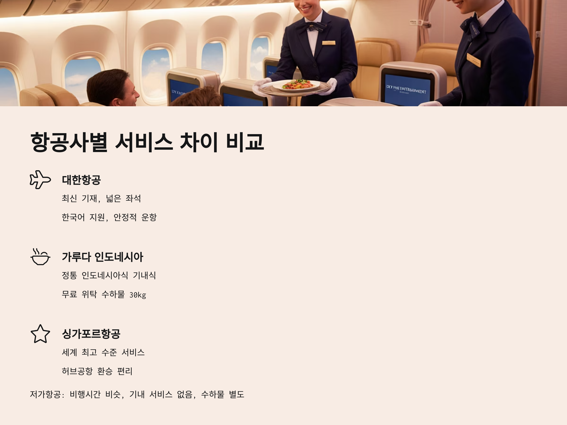 - 대한항공: 최신 기재, 넓은 좌석 간격, 한국어 지원, 안정적인 운항