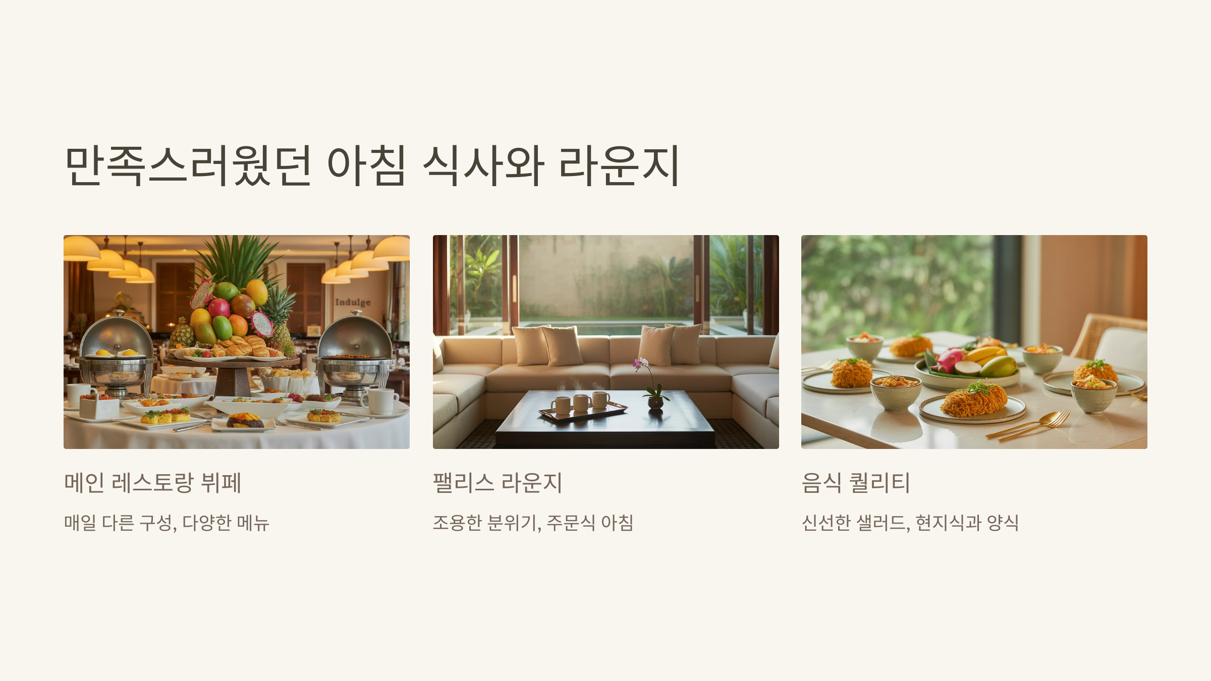 메인 레스토랑에서는 매일 다른 구성의 뷔페식 아침이 제공되어 골라 먹는 재미가 있었어요. 신선한 샐러드, 따뜻한 국물 요리, 현지식과 양식 메뉴까지 다양하게 준비되어 있었고, 음식 하나하나의 퀄리티도 상당히 좋았어요.