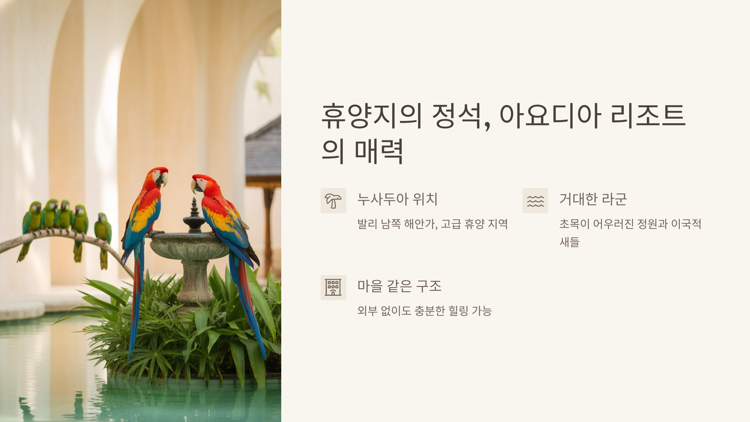 발리 남쪽 해안가에 자리한 누사두아는 관광객보다도 고급 휴양을 원하는 이들에게 알려진 조용한 지역입니다. 이곳 중심에 있는 아요디아 리조트는 거대한 라군과 초목이 어우러진 정원을 품고 있었고, 산책로를 따라 걷다 보면 이국적인 새들과 마주치는 재미도 있었어요.